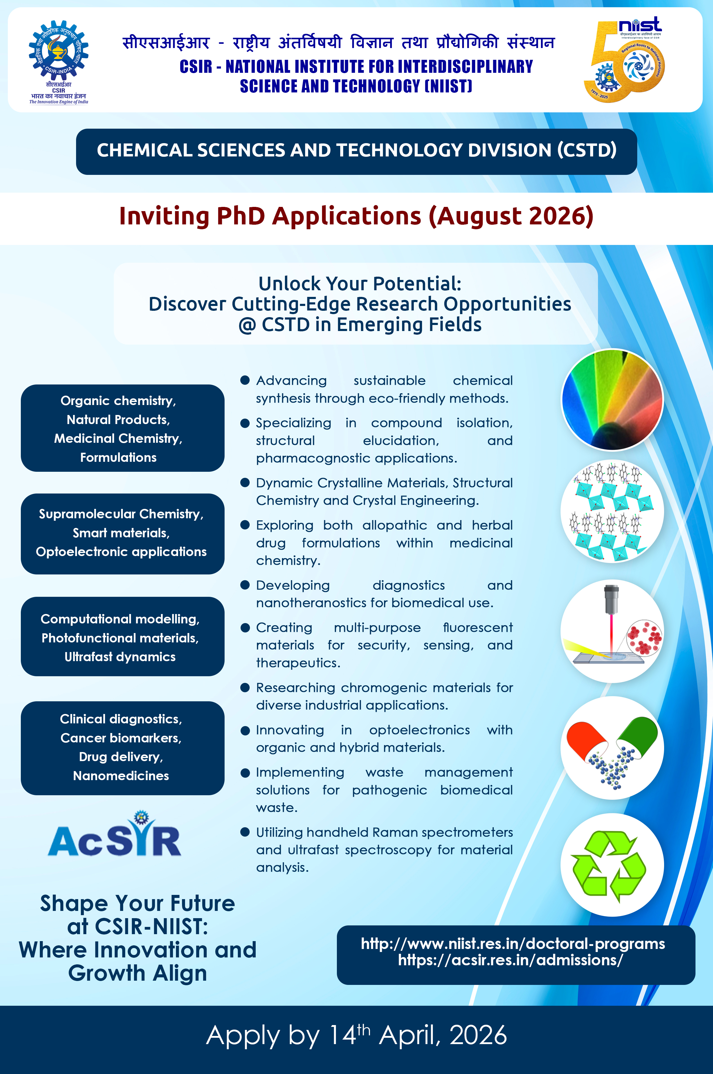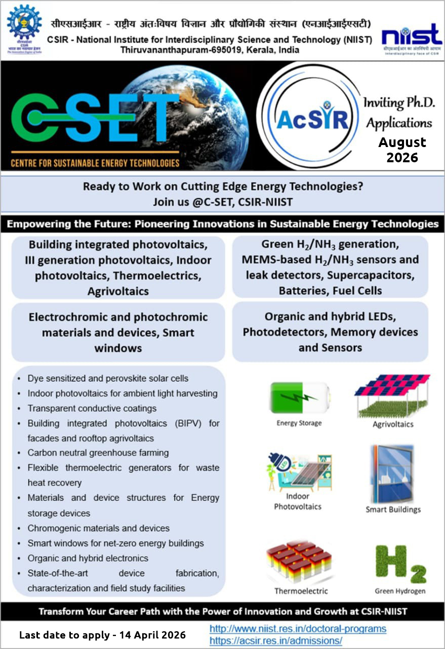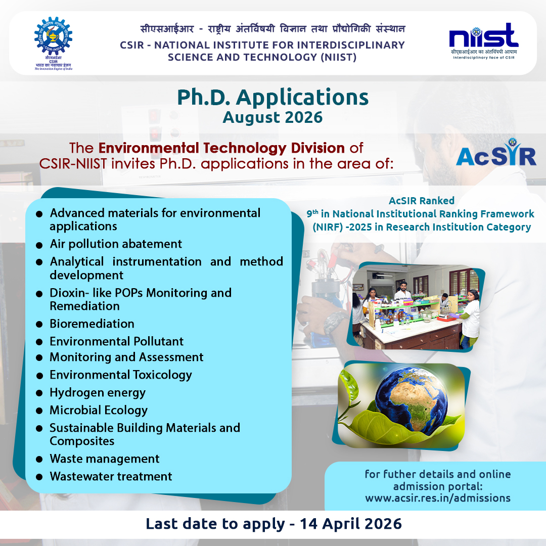 Admission for Ph.D. programs in CSIR-NIIST under the Academy of Scientific and Innovative Research (AcSIR) will be held twice a year (January and August session) and will be advertised separately in the AcSIR and CSIR-NIIST website.