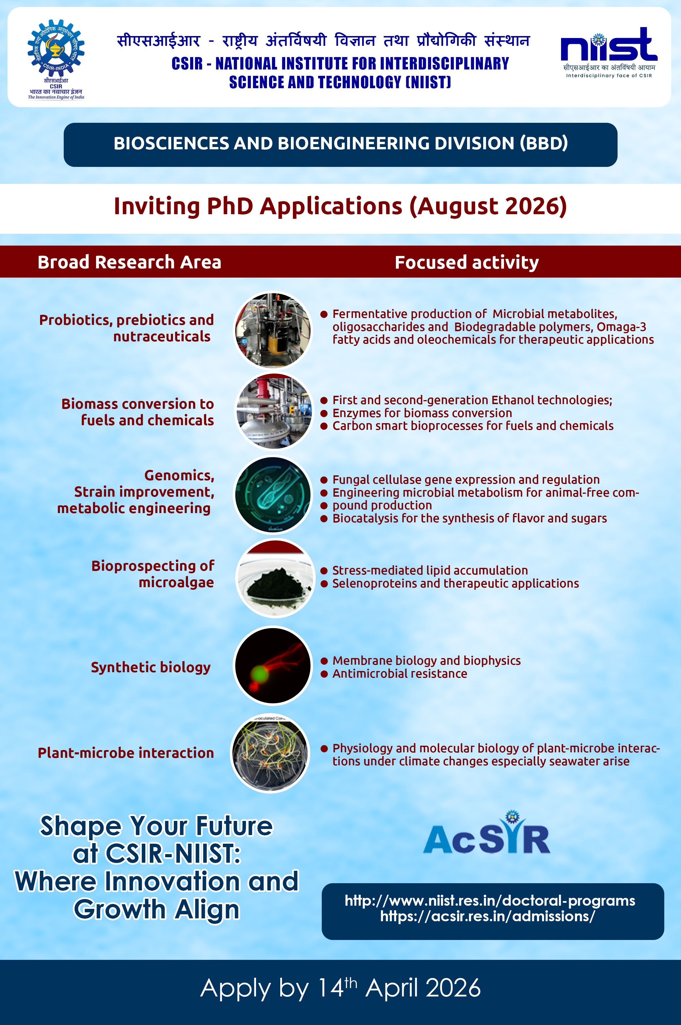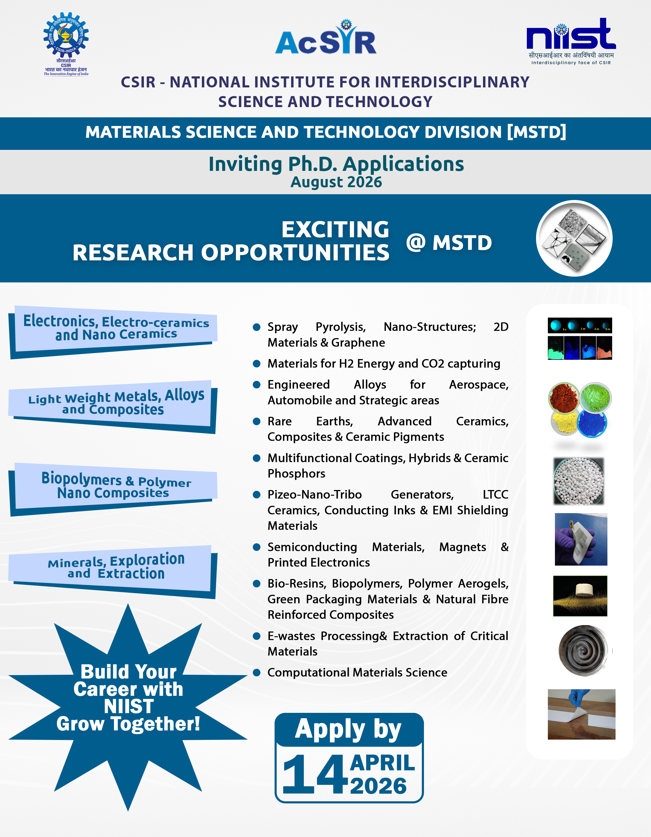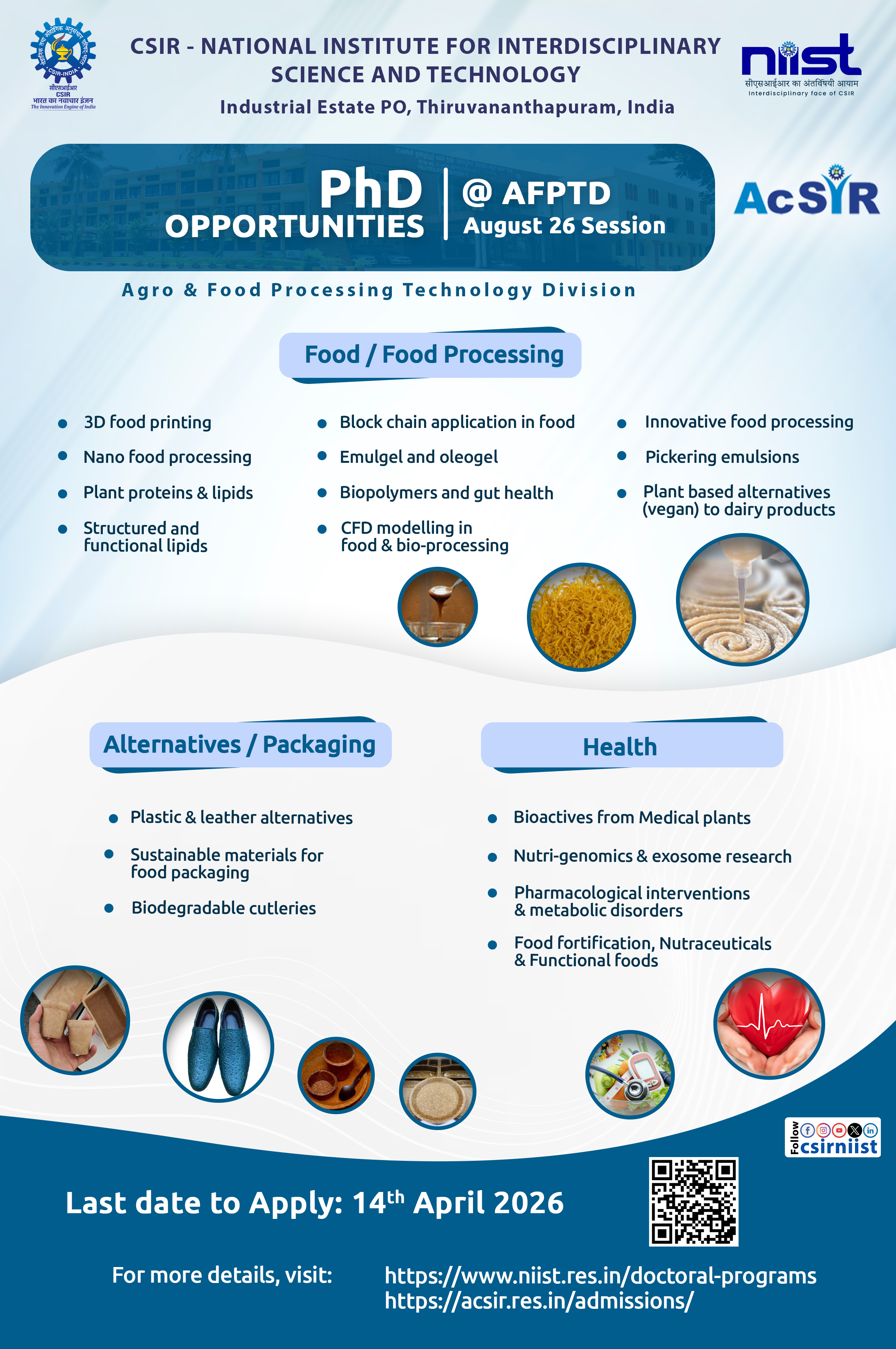 Admission for Ph.D. programs in CSIR-NIIST under the Academy of Scientific and Innovative Research (AcSIR) will be held twice a year (January and August session) and will be advertised separately in the AcSIR and CSIR-NIIST website.
